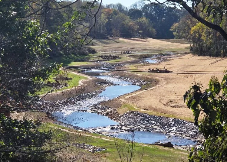 Building a new stream channel for Blackwater Creek through the existing lakebed